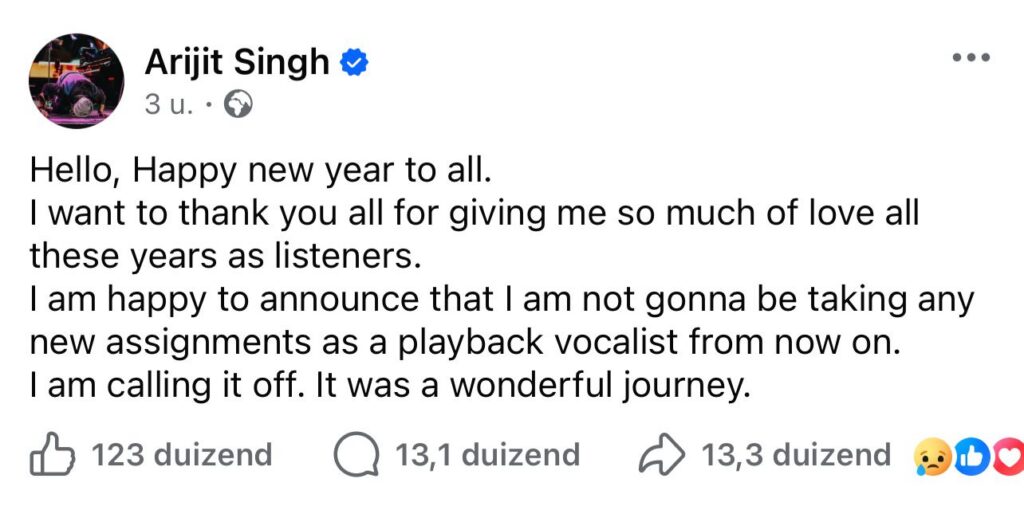 De muziekwereld reageert geschokt op het bericht dat Arijit Singh deze week op Facebook deelde. In een korte, maar emotionele boodschap wenste hij zijn fans een gelukkig nieuwjaar en bedankte hij hen voor de liefde die hij jarenlang heeft ontvangen. Vervolgens kwam de aankondiging die wereldwijd insloeg als een bom: Arijit Singh stopt met het aannemen van nieuwe opdrachten als playbackzanger.